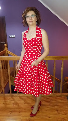 Wyzwanie nr 3 w zabawie Między nami kobietami to sukienka. Szukałam zawzięcie wzoru na sukienkę w moim ulubionym stylu lat 60 (pin up). Dopasowany gorset, wiązany lub zapisany na karku i szeroka rozkloszowana spódnica. Oczywiście czerwona w grochy. Najlepiej z wielowarstwową tiulową halką.